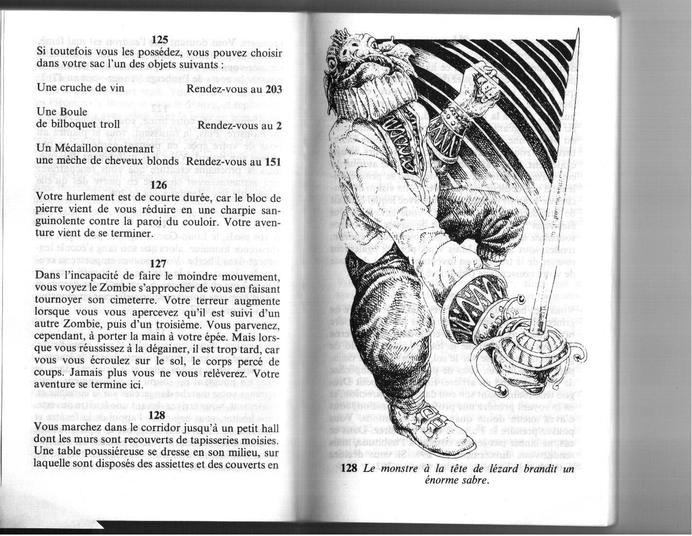Je m'explique, j'ai réussi à acheté sur le net plusieurs ldvelh en très bon état et à très bon prix, je voulais attaquer le seigneur de l'ombre et en le feuilletant je me rends compte d'un truc tout bizarre : le § 124 enchaîne au verso sur une superbe illustration et juste en face, le § 128 tronqué. Il manque le 125, 126, 127 et un bout du § 128. J'ai vérifié il ne manque pas de page, l'illustration étant imprimé directement au dos de la page du § 124. quelle est donc cette vilaine erreur ?