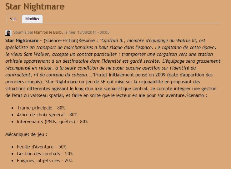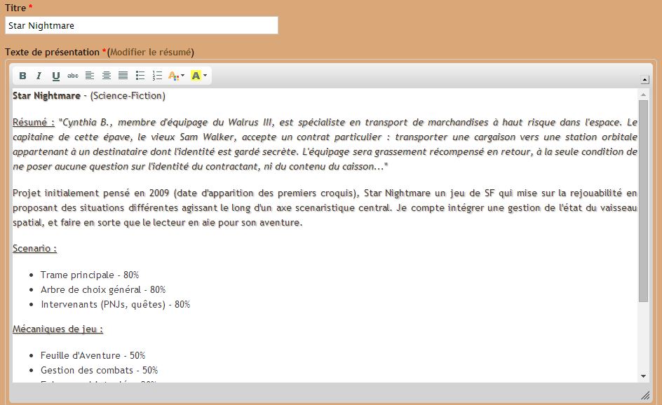 Moi j'ai eu des soucis de mise en page sur la description de mon projet Star Nightmare (le retour à la ligne n'est pas pris en compte) ; donc si quelqu'un a une idée à ce sujet, je tourne sur Chrome, Win 7.